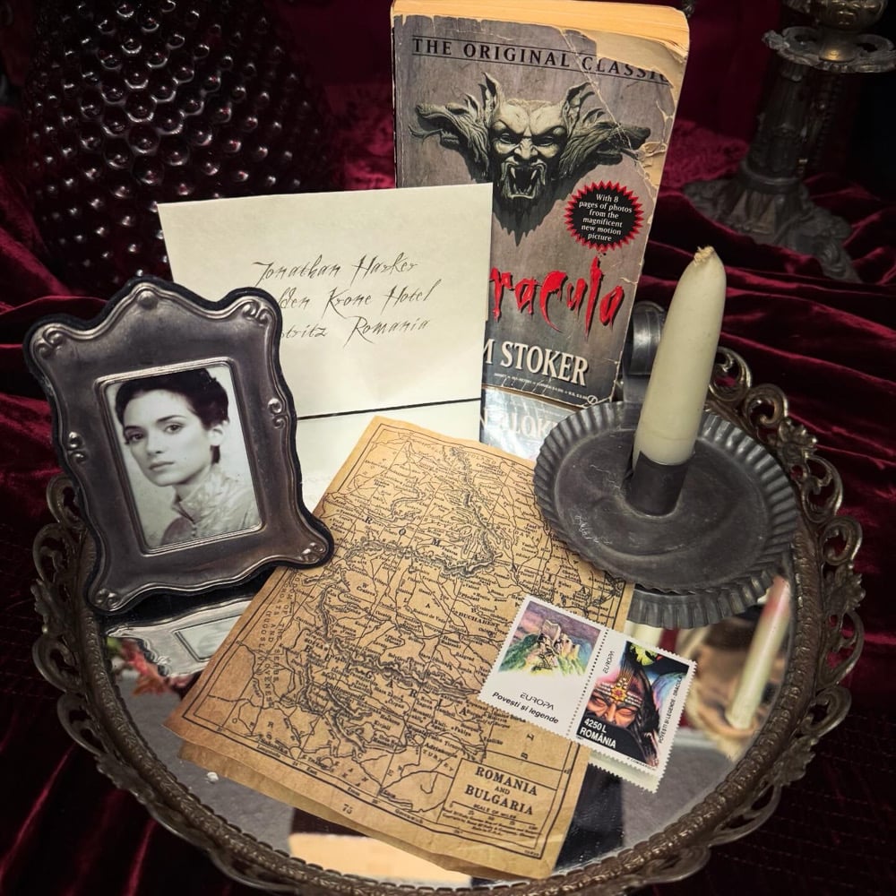 Comes with Portrait of Mina Harker in Vintage Silver Frame, Letter to Jonathan Harker signed D, 1992 Dracula Movie Cover Paperback, Map of Romania, Vintage Silver Chamber Candle Holder & 2 Romanian Stamps.