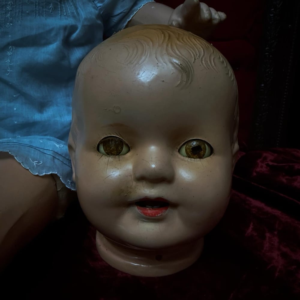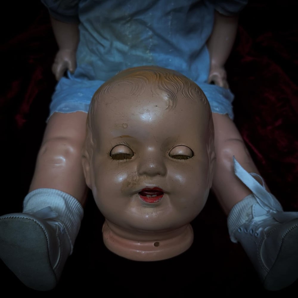 Headless Harriet is a 1940s composition doll whose head and body have parted ways over the decades. Standing 22 inches tall (without her head), she is a wonderfully strange piece for collectors of vintage dolls or oddities. Harriet was once housed inside the Haunted Museum at The Glass Coffin in Austin, TX, and is now up for adoption. 🖤🕯️